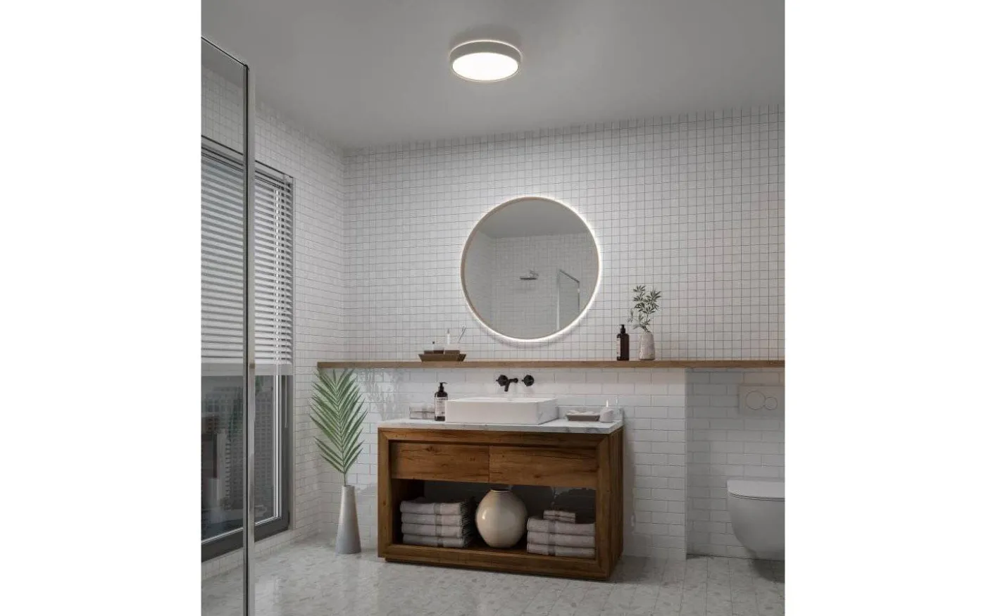 Noxy Plafond från danska Nordlux. Plafonden har inbyggd 3-stegs dim vilket innebär att du enkelt kan justera färgtemperaturen från kallt till varmt ljus med din väggströmbrytare. (Obs, fungerar ej ihop med väggdimmer).