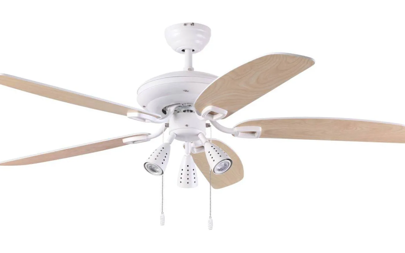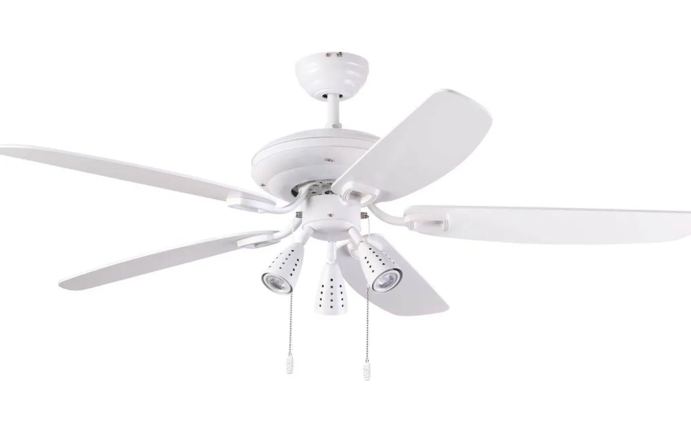 Motorn är vit. Bladen är vändbara, vita på ena sidan och träimitation på andra sidan.
