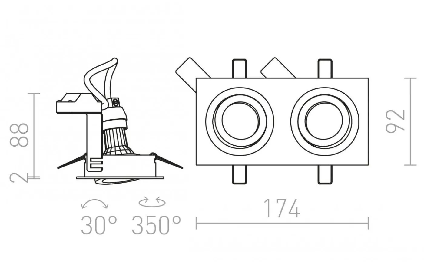 Infälld vippbar lampa av aluminium, finns i naturlig finish eller två olika lackerade varianter, för GU10-ljuskällor.