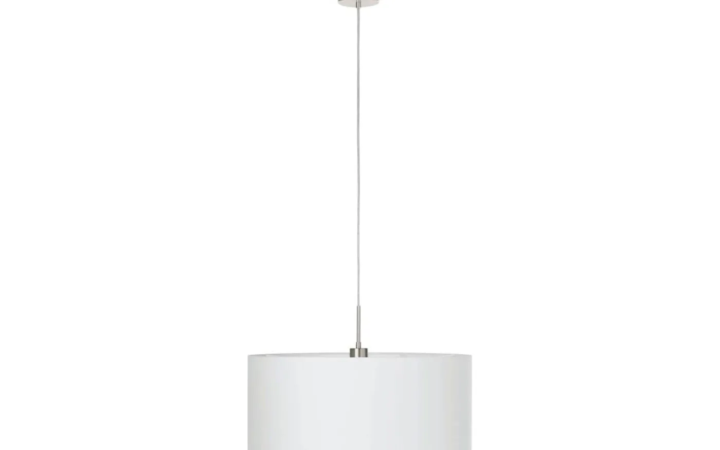 Denna pendelarmatur från serien PASTERI är gjord av satin nickelstål och tyg i vitt.