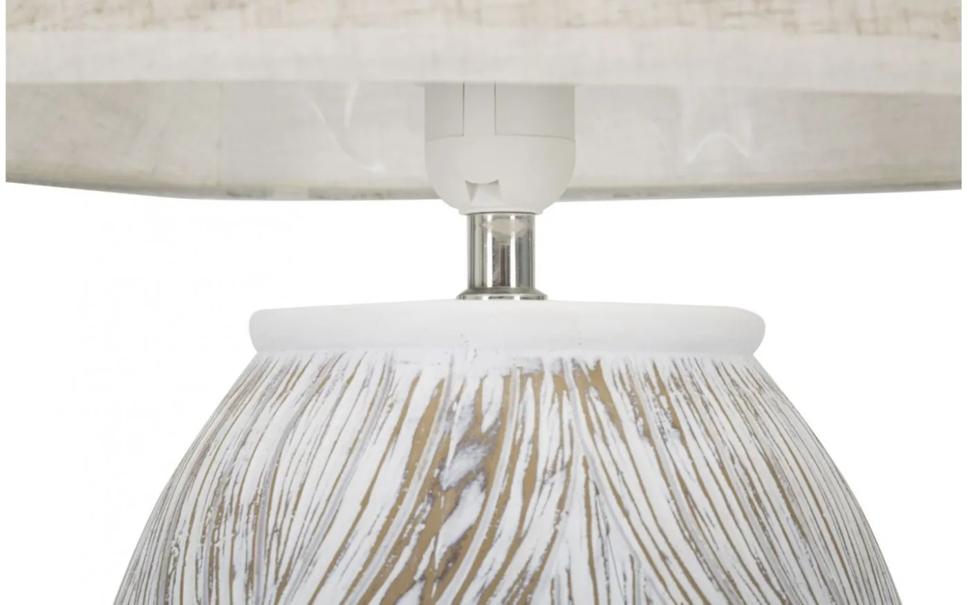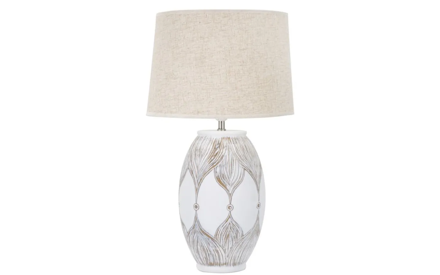 Bordslampa i harts med eleganta linjära dekorationer som minns löv. Komplett med lampskärm i beige tyg.