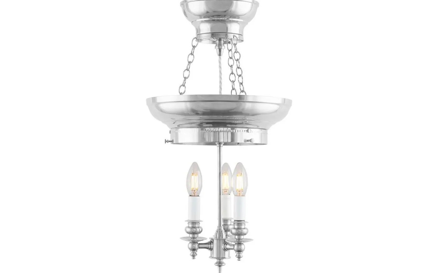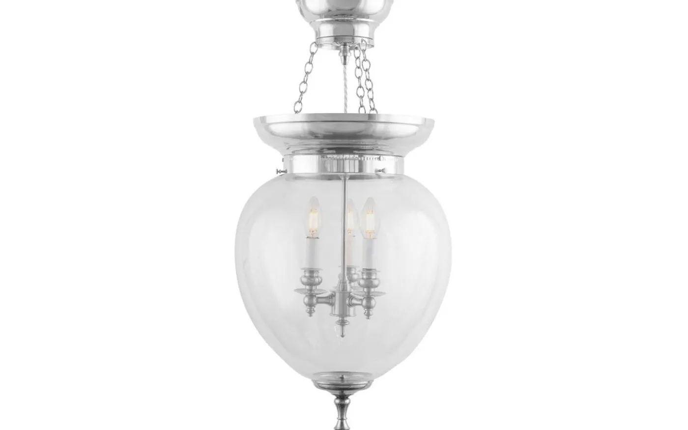En stor klassisk ampel, tillverkad helt i förnicklad mässing. Främst avsedd som allmänbelysning i större trapphallar och korridorer. Kan förlängas med extra kätting upp till 100cm. Kan hängas på krok eller skruvas mot taket (c/c 60-70mm). Önskar man gå in med kuloledning från sidan borrar man upp ett hål i mässingskanten.