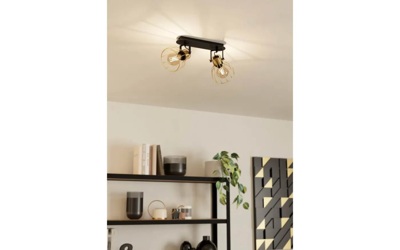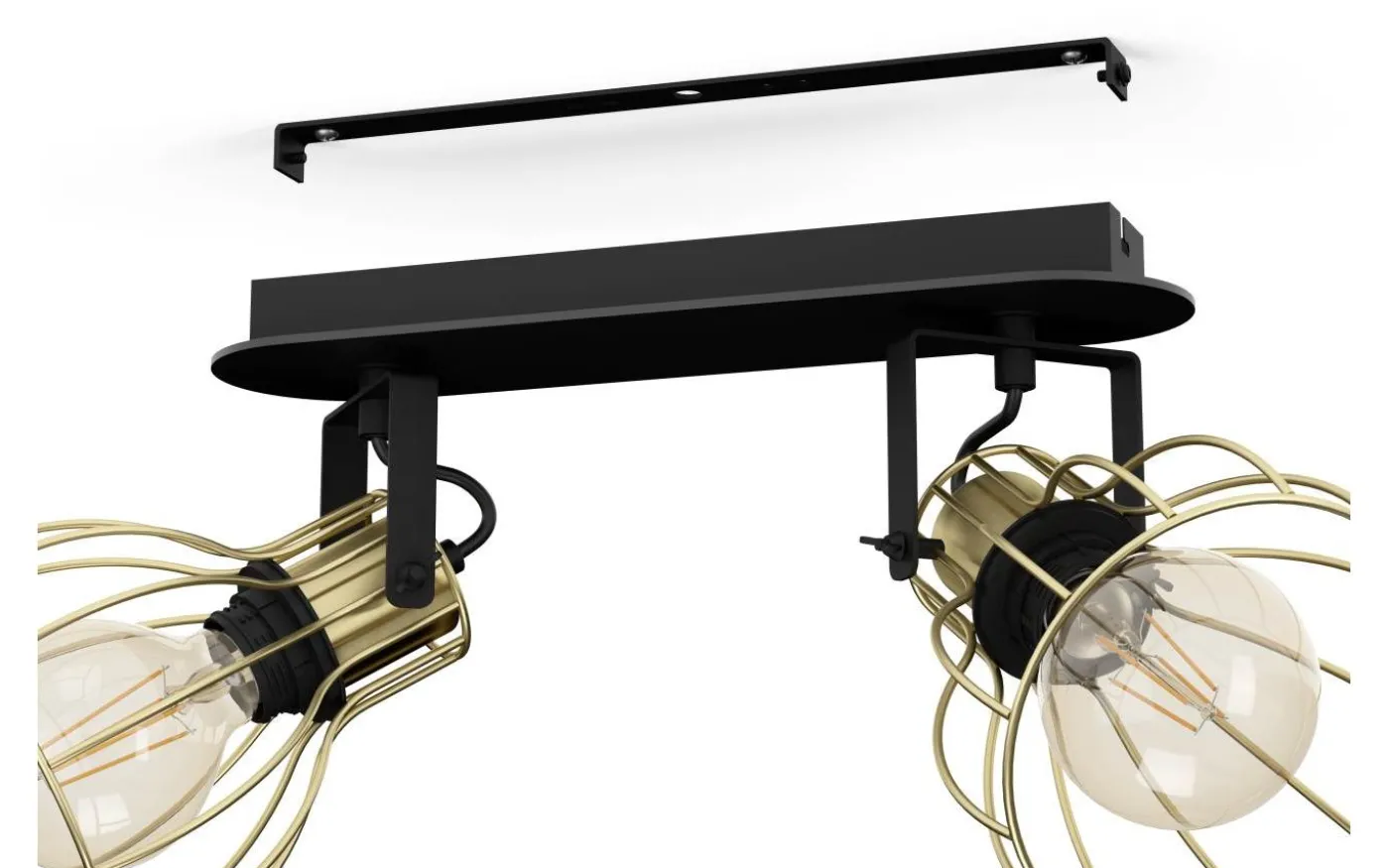 SAMBATELLO taklampa har en långsträckt design med en finish i svart och guld. På kroppen sitter två justerbara trådspotlights, som skapar ett fascinerande spel av ljus och skugga när ljuset är på. Takspotlighten kompletterar interiörer i industriell stil och ger med sina svängbara huvuden fokuserad belysning, oavsett om det är i köket, vardagsrummet, sovrummet eller hallen.