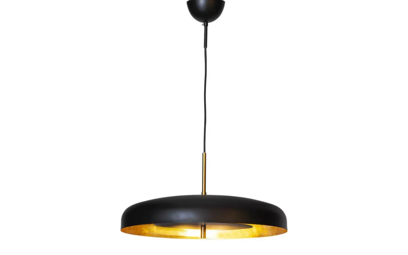 Fina Shelby taklampa från By Rydéns är gjord i svart metall med insida av bladguldsfinish. Den guldiga insidan reflekterar ljuset vackert och ljuskällan placeras innanför en avbländare vilket gör att taklampan avger en behaglig, indirekt ljusbild.