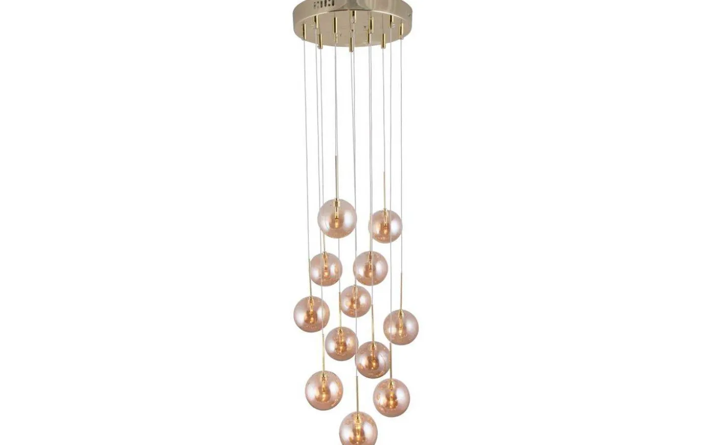 Lampans takplatta i mässingfärgad metall monteras med krokupphäng mot taket och har 12 vajrar med amberfärgade glaskupor. Minsta totalhöjd 33 cm och högsta totalhöjd 213 cm för att skapa ett intressant mönster med glaskuporna.