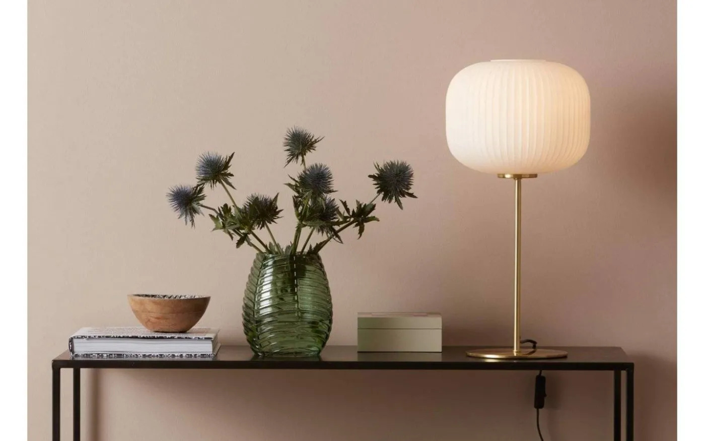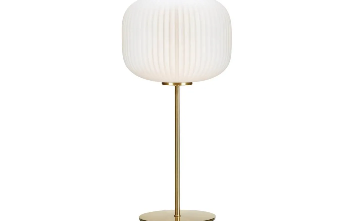 Fina bordslampan Sober är en läcker bordslampa, från välkända Markslöjd, med fot i borstad mässing kombinerat med vit glasskärm.