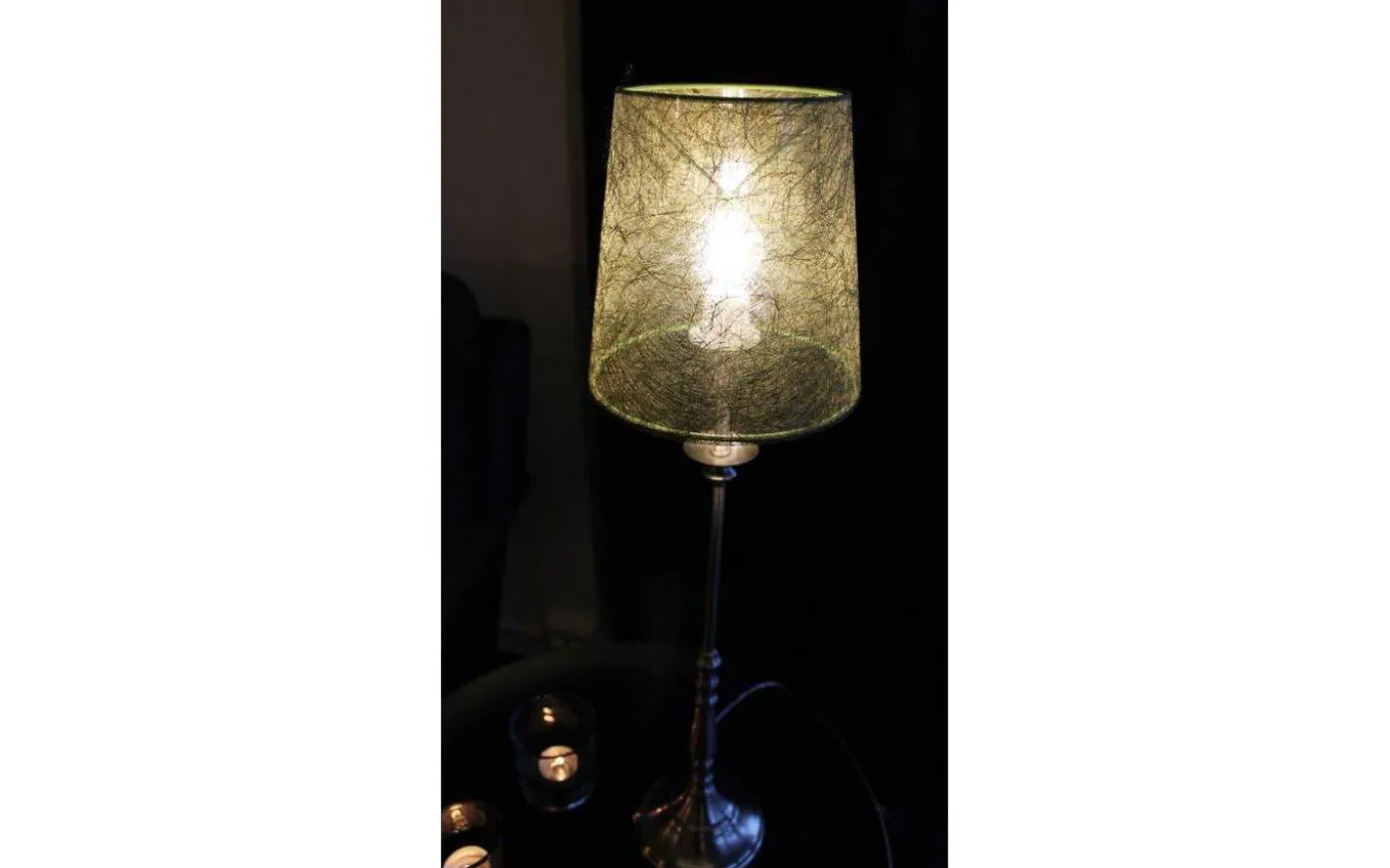 Spunnet lampskärm från Oriva är tillverkad i PVC med ett mönster likt spunnet sockervadd. Lampskärmen har klofäste som fäst på en klotformad ljuskälla.