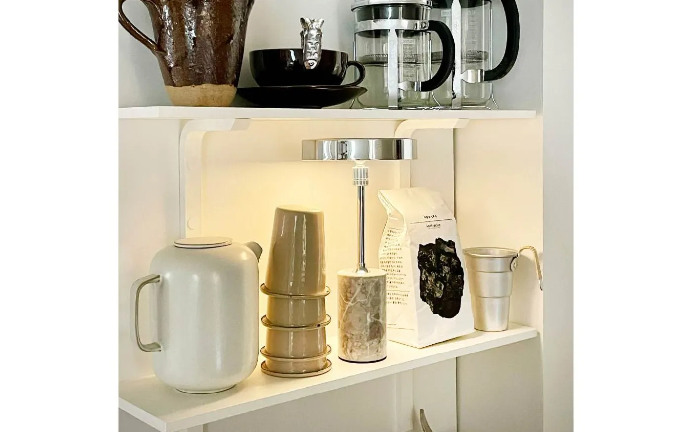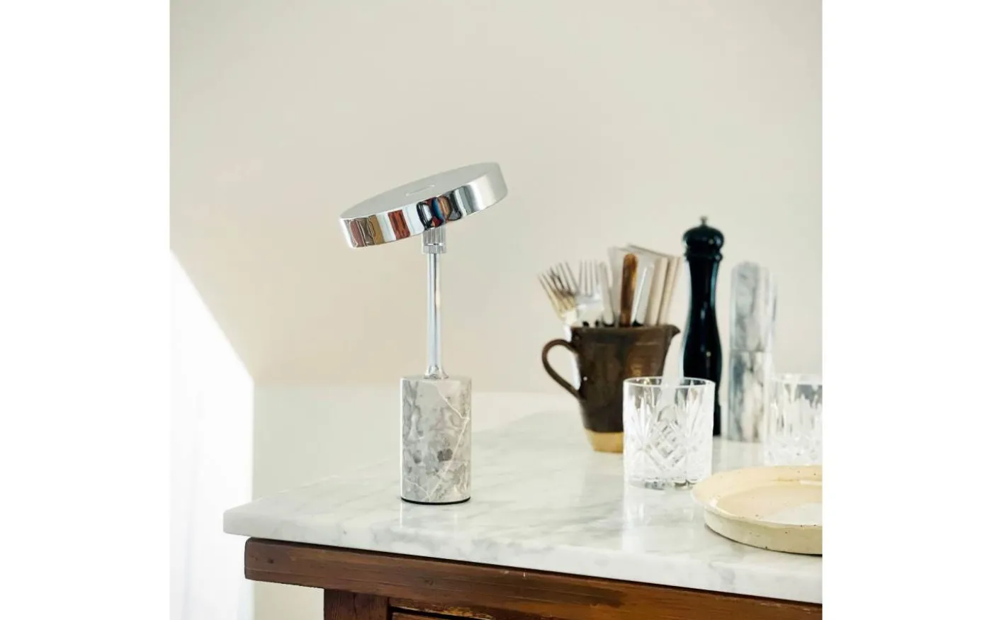 Starlight från välkända Dyberg Larsen är en stilfull, uppladdningsbar bordslampa med solid marmorbas och en härlig kromad metallskärm med integrerat LED. Ljuset kan du enkelt reglera i tre steg med hjälp av strömbrytaren som sitter på lampskärmen.