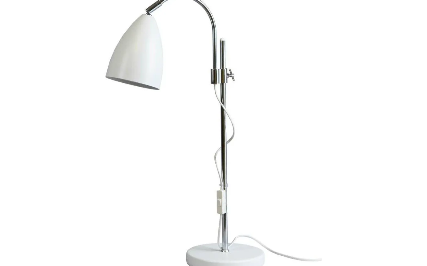 Sway bordslampa har en stomme och lamphuvud i mattvit metall kombinerat med ett stativ och detaljer i blank krom. Lamphuvudets placering justerar du själv då det går att höja och sänka, samt att du kan rikta lamphuvudet efter eget önskemål – allt för att du ska få det optimala läsljuset! Sladden som slingrar sig runt stativet är en modern detalj och på denna är även strömbrytaren placerad, så att du lätt kan komma åt och tända/släcka.