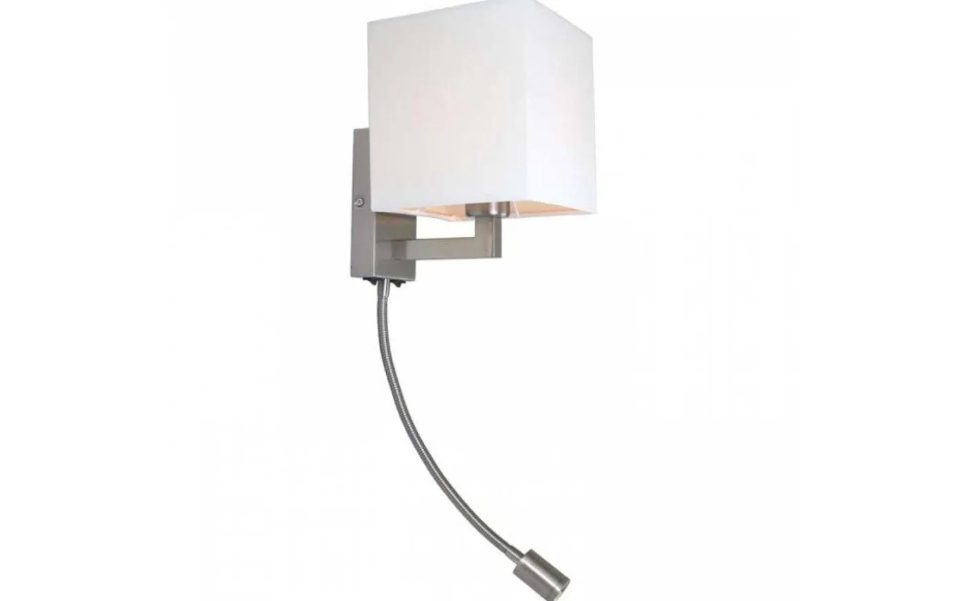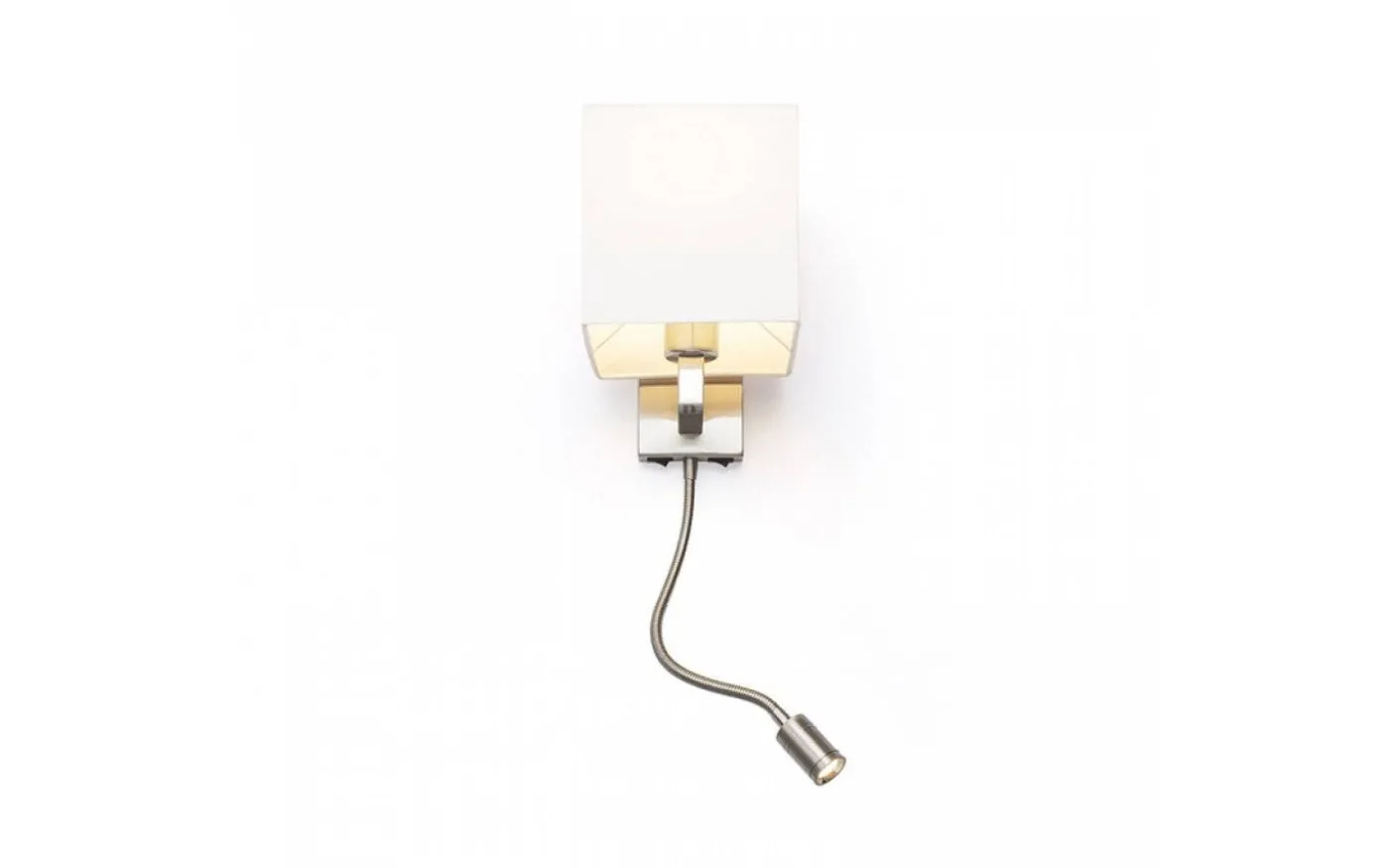 Vägglampa med textilskärm och LED-läslampa på svanhals. Båda ljuskällorna kan tändas individuellt med knappar som sitter på den kantiga basen.