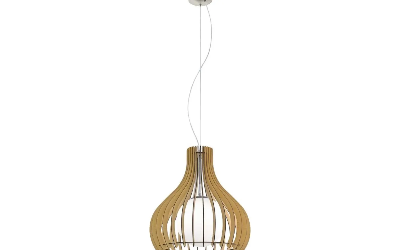 Pendellampan TINDORI har en rundad lampskärm gjord av naturliga lönnsegment med en baldakin i matt nickelmetall. Den inre vita glaskulan kompletterar ljusets moderna utseende och ger en attraktiv belysning. Med en diameter på 50 cm smälter taklampan sömlöst in i moderna inredningsstilar och ger en välkomnande belysning i vardagsrummet eller ovanför bordet i matsalen.