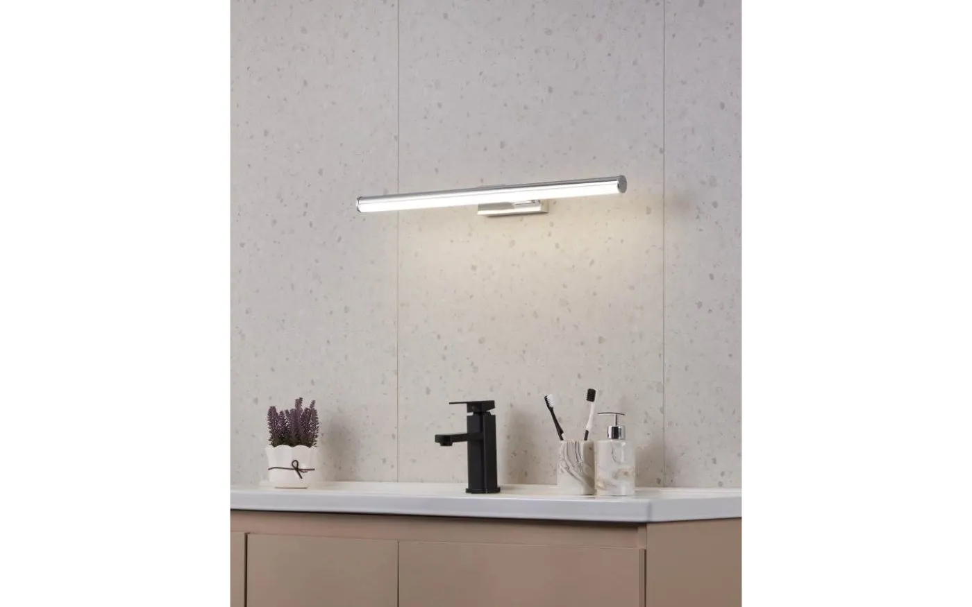 VADUMI LED-spegellampan är gjord av kromfärgad metall och har en ljuspanel i vit plast. De integrerade lysdioderna ger ett neutralt vitt ljus. Produkten är lämplig för användning i badrummet på grund av dess IP44-skydd mot sprutvatten. Vägglampan är 60 cm lång och smälter sömlöst in i moderna interiörer och ger en snygg belysning i badrummet över spegeln.