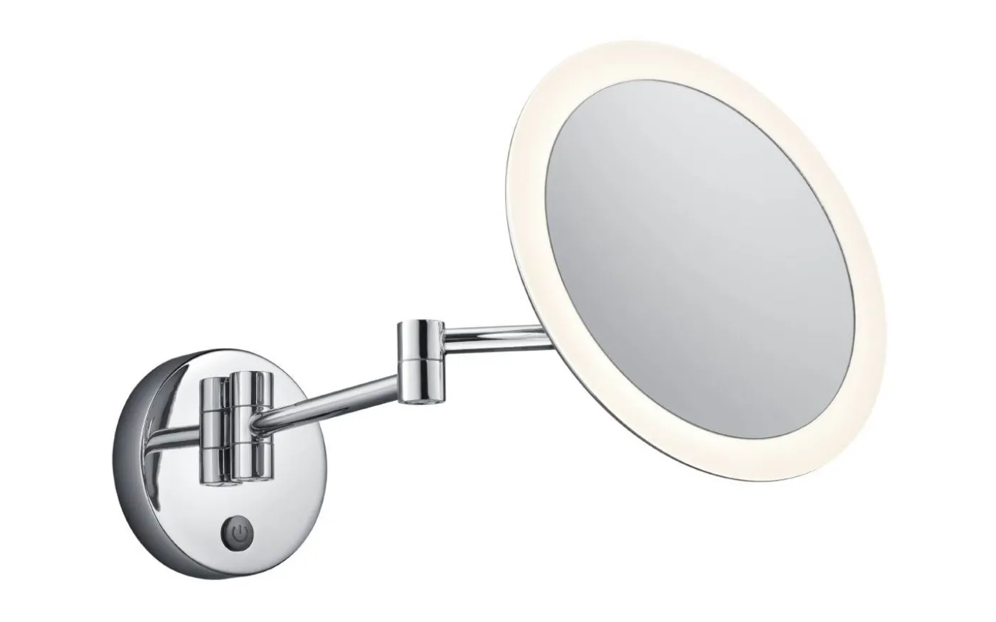 Spegel och lampa i ett! VIEW LED-väggspegeln imponerar med sin enkla design och fulla funktionalitet. Den runda spegeln med integrerad lampa är kromad och smälter sömlöst in i en mängd olika badrumsinredningar. VIEW är utrustad med trippelförstoring och en touchknapp för att tända och släcka lampan. Spegeln kan vridas för en individuell och lämplig justering, vilket gör den till en riktig berikande detalj för ditt badrum. Lampan är utrustad med en IP 44-skyddsklassning, vilket innebär att lampan kan användas i badrummet utan problem. Den integrerade LED-ljuskällan har 3000 Kelvin, 280 lumen och en diameter på 21,6 cm. När spegeln är helt utfälld har den en projektion på 36 cm. Ljuskälla: inklusive 1x SMD LED, 3W · 1x 280 lm, 3000K. Extra information: ,IP44, Förstoring 3x, Ej dimbar, På/Av-pekfunktion, Vridbar, Väggmontering