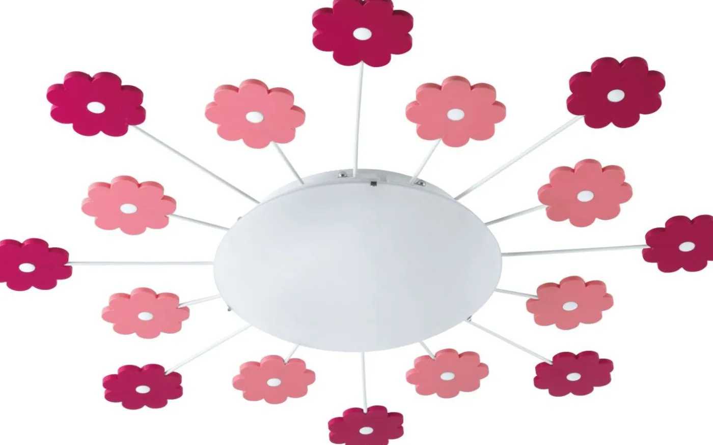 Taklampan VIKI 1 har en rund ljuspanel av vitt satinglas med vit metallfot. Designen har rosa blommotiv fästa på metallbasen med metallstöd. De rosa blommorna har fluorescerande prickar som fortsätter att lysa i mörkret i 15 till 20 minuter efter att ljuset släckts. Med sitt lekfulla blommotiv fungerar taklampan utmärkt i barns sovrum, oavsett om det är för en tjej eller en pojke.