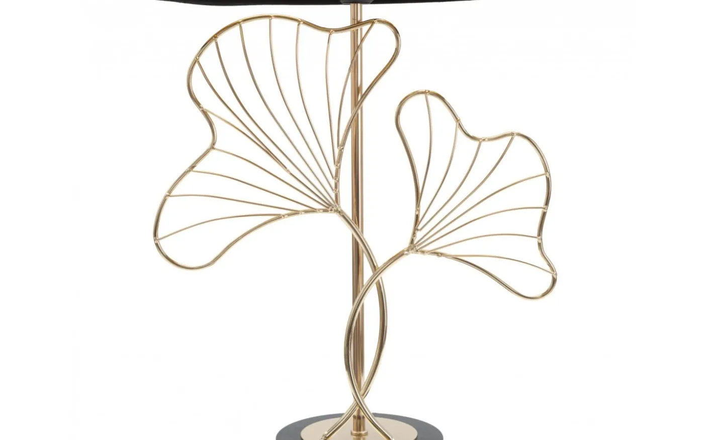Bordslampa i gyllene metall med sockel och lampskärm i svart tyg. Den eleganta dekorationen påminner om löv. Föreningen mellan guld och svart skapar en perfekt kontrast som passar alla rum.