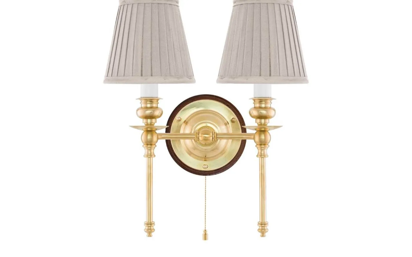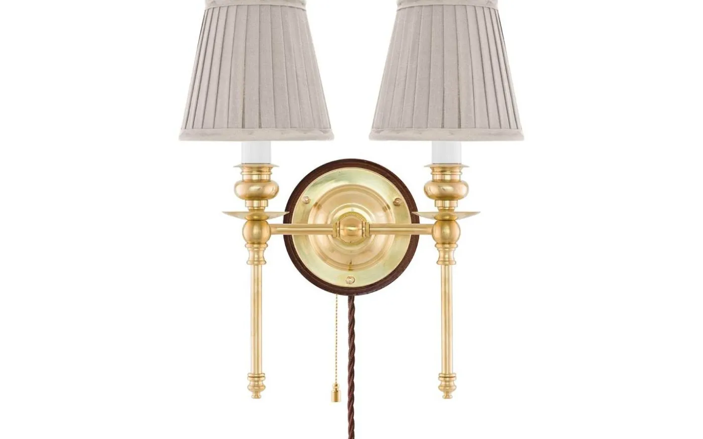Klassisk väggarmatur för textilskärm, tillverkad helt i mässing. Främst avsedd som allmän- eller stämningsbelysning i exempelvis en korridor eller sittande på var sin sida om en spegel eller tavla. För fast montage. Kan kompletteras med knoppledning och stickkontakt för vanligt vägguttag