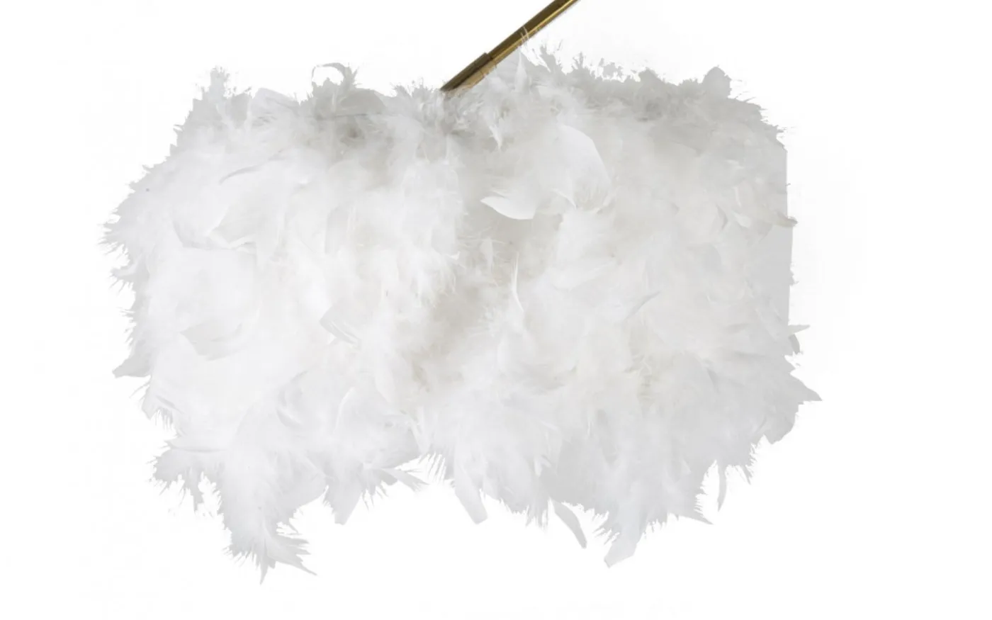 Golvlampa i svart metall med en välvd och linjär design komplett med elegant lampskärm av syntetiska fjädrar.
