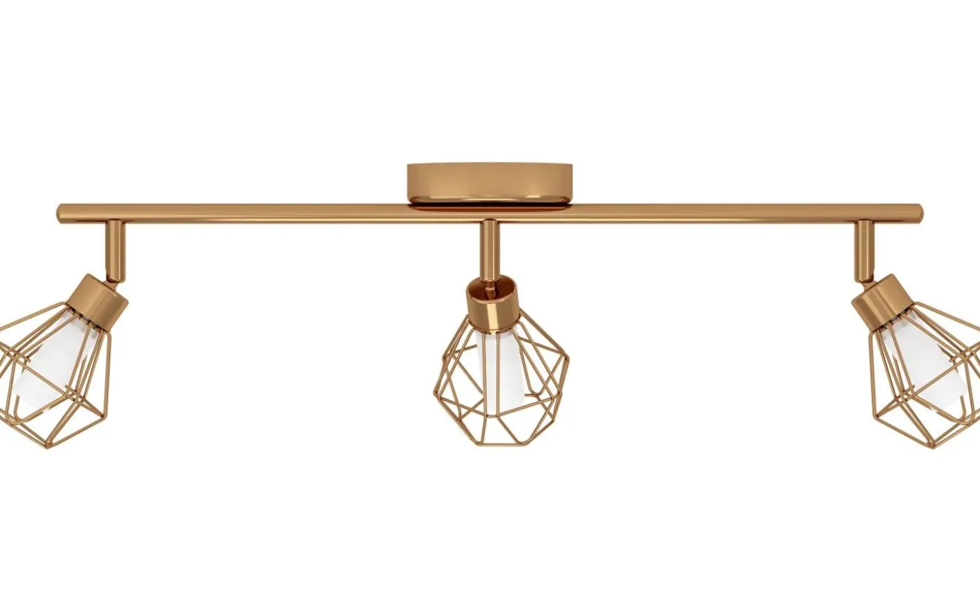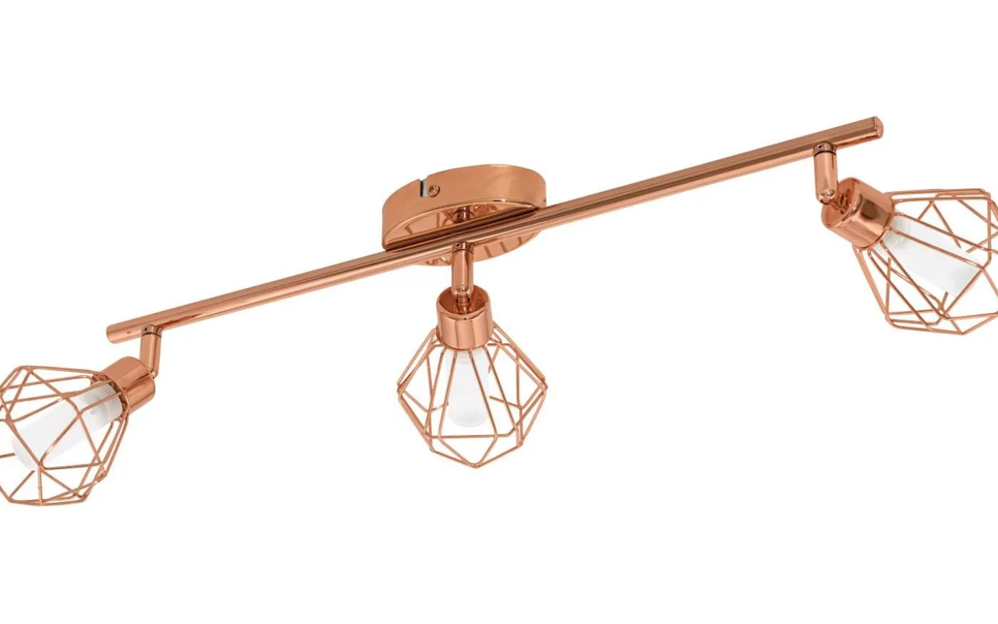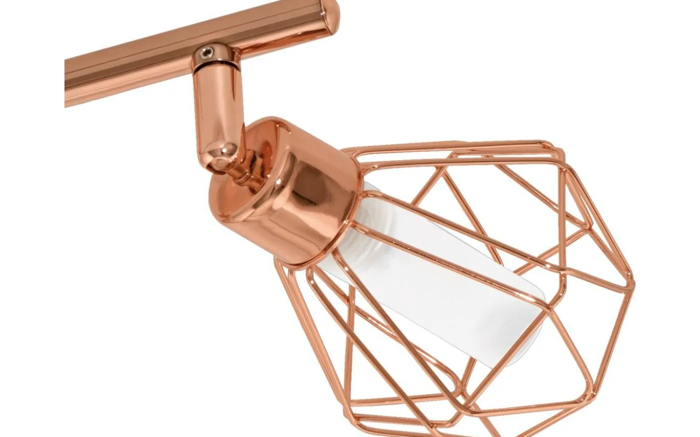 ZAPATA LED-taklampan har en linjär metallkropp i en kopparfärgad finish med tre justerbara diamantformade spotlights gjorda av tråd. Varje spotlight har ett inre vitt satinglaselement. Lampskärmarna skapar ett fascinerande spel av ljus och skugga så fort ljuset tänds. Taklampan smälter sömlöst in i moderna interiörer. Designen har vridbara spotlighthuvuden som gör att du kan justera ljuset för att accentuera enskilda delar av rummet, oavsett om det är i köket, vardagsrummet, sovrummet eller hallen. Produkten innehåller G9 LED-lampor, som ger ett behagligt varmvitt ljus.